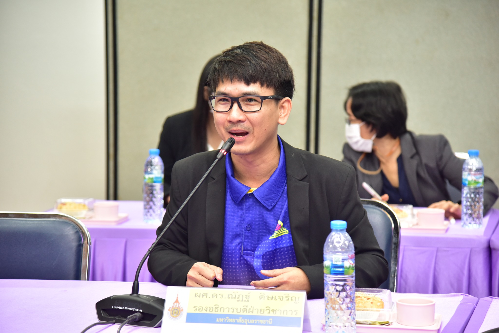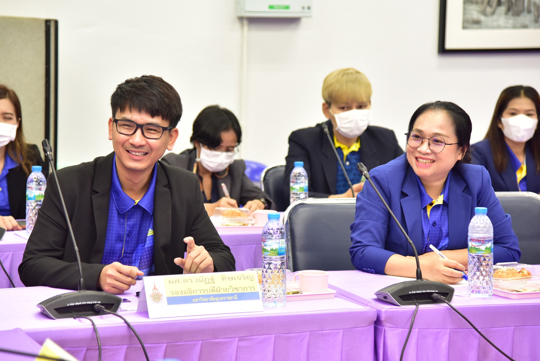 รศ.ดร.กฤษณ์ชนม์ ภูมิกิตติพิชญ์ รองอธิการบดีมหาวิทยาลัยเทคโนโลยีราชมงคลธัญบุรี และ รศ.ดร.เกียรติศักดิ์ พันธ์ลำเจียก ผู้ช่วยอธิการบดี ให้การต้อนรับผู้บริหารและเจ้าหน้าที่จากมหาวิทยาลัยอุบลราชธานี ในการเข้าศึกษาดูงานทางด้านระบบบริการการศึกษา การให้บริการ Digital Transcript และ การดำเนินงานด้าน Credit bank