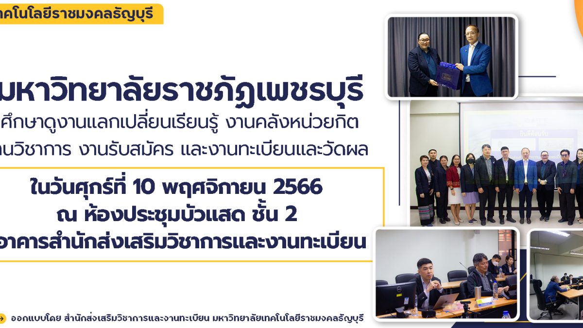 รศ.ดร.เกียรติศักดิ์ พันธ์ลำเจียก ผู้ช่วยอธิการบดี และผศ.ณัชติพงศ์ อูทอง ผู้อำนวยการสำนักส่งเสริมวิชาการและงานทะเบียน ให้การต้อนรับผู้บริหารและเจ้าหน้าที่จากมหาวิทยาลัยราชภัฏเพชรบุรี ในการเข้าศึกษาดูงานแลกเปลี่ยนเรียนรู้ งานคลังหน่วยกิต งานวิชาการ งานรับสมัคร และงานทะเบียนและวัดผล วันศุกร์ที่ 10 พฤศจิกายน 2566 ณ ห้องประชุมแสด ชั้น 2 อาคารสำนักส่งเสริมวิชาการและงานทะเบียน มทร.ธัญบุรี